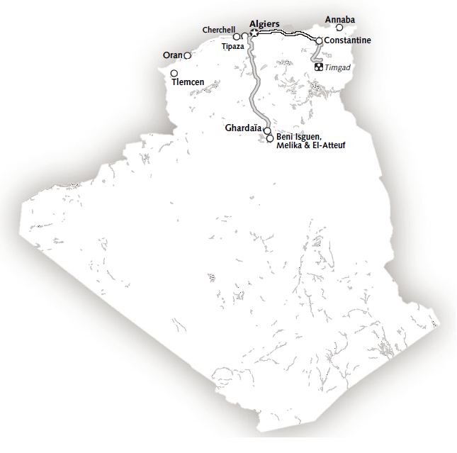 الجزایر کشوریه در شمال آفریقا. از شرق با لیبی و تونس، از غرب با مراکش و جمهوری (خودخوانده) صحرا، از جنوب با مالی و نیجر و از جنوب غربی با موریتانی همسایه است. از شمال هم که به دریای مدیترانه می رسه. فاصله چندانی با جنوب ایتالیا و فرانسه نداره. پس طبیعیه که ردپای رومی ها و فرانسوی ها به راحتی تو این سرزمین پیدا بشه. این کشور در زمان باستان بخشی از مستعمرات روم بوده که بعدها به دست مسلمانان می افته. مدتی هم زیر سلطه پاشاهای عثمانی بوده و بالاخره اروپایی ها به ویژه فرانسوی ها گامهای نحسشون رو روی خاک این سرزمین می ذارن و تا دهه 60 قرن بیستم اینجا موندگار میشن تا بالاخره طی شورشها و انقلاب معروف الجزایر بعد از کلی کشت و کشتار این کشور مستقل می شه. بهتره اطلاعات بیشتر در مورد تاریخ این کشور رو توی ویکیپدیا بخونید.