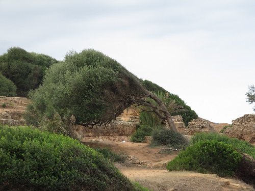 تک درختان خم شده در مقابل باد، شهر باستانی تیپازا، کنار دریای مدیترانه. توی این عکس باد در حال وزیدن نیست. شبیه این منظره رو توی منجیل هم می تونید ببینید.