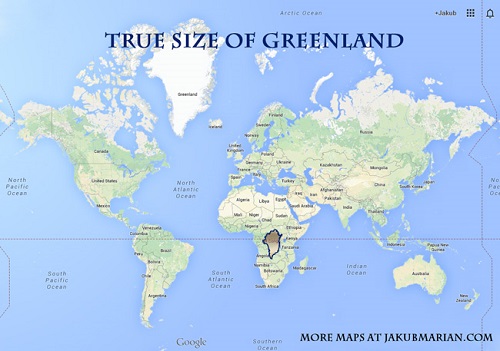 این عیب خودش رو در مورد گرینلند به خوبی نشون میده چون در عرض های خیلی شمالی قرار گرفته. برای اینکه متوجه بشید که گرینلند چقدر بزرگه، اندازه واقعی اون روی قاره آفریقا نشون دادم: