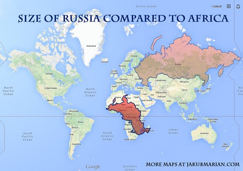 خیلی جالب بود نه؟ همچین چیزی در مورد روسیه هم صادقه. باور می کنید که اندازه آفریقا تقریبا 2 برابر روسیه است (از نظر مساحت)؟ وقتی اندازه روسیه رو روی نقشه مسطح طوری کوچیک کنیم که به اندازه واقعی اون روی کره زمین نزدیک بشه و بعدش اون رو روی قاره آفریقا بندازیم، چنین چیزی رو می بینیم: