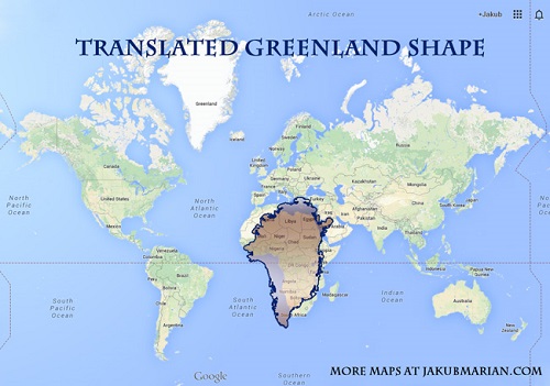 ما معمولا به دیدن نقشه هایی که Google Map یا شرکتهای دیگه می کشن عادت کردیم. (نقشه هایی که در پایین می بینید از Google Map گرفته شدن). احتمالا همیشه این سوال رو از خودتون داشتید که مگه این گرینلند چقدر بزرگه؟ اگه فقط شکل این سرزمین رو بگیریم و روی قاره آفریقا بندازیم، به این نتیجه می رسیم که گرینلند یه صحرای غولپیکر برفیه: