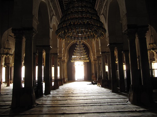 مسجد جامع قیروان. کف اون به جای فرش با حصیر پوشونده شده. بیشتر این ستونها از بناهای قدیمی روم باستان و به ویژه از منطقه کارتاژ به اینجا آورده شده اند.