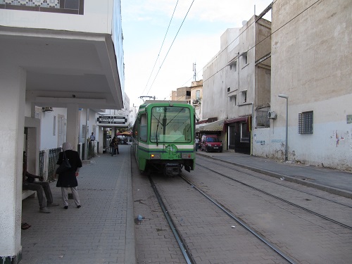 ایستگاه تراموا در شهر تونس. کثیفی خیابون کاملا مشخصه. این خیابونها فقط ویژه تراموا نیست ماشین های معمولی هم از روی این ریلها عبور می کنند.